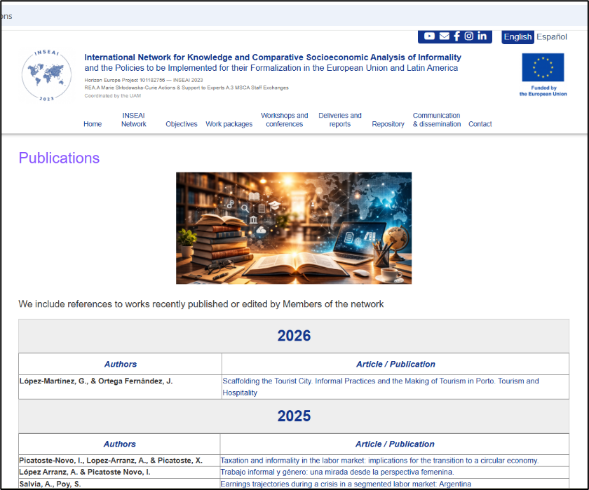 The Letter from the Coordinator (23 February 2026) announced the creation of a new PUBLICATIONS window on the INSEAI website. This space will compile articles, books, chapters and audiovisual outputs produced within the framework of the project. Members are encouraged to submit references to recent works and to explicitly acknowledge that outputs are carried out within Project 101182756 — INSEAI 2023 (MSCA Staff Exchanges). The Letter also reiterated the protocol for recording public meetings and renewed the call to intensify dissemination of the Employment and Informal Earnings Survey.