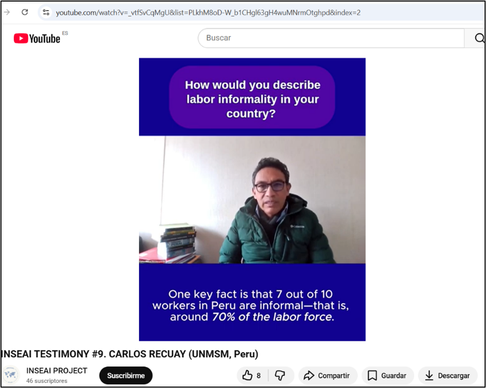 INSEAI Testimony #9 features Carlos Recuay (UNMSM, Peru), reflecting on the scale and structural roots of labour informality in Peru, where nearly 70% of the workforce operates in informal conditions.