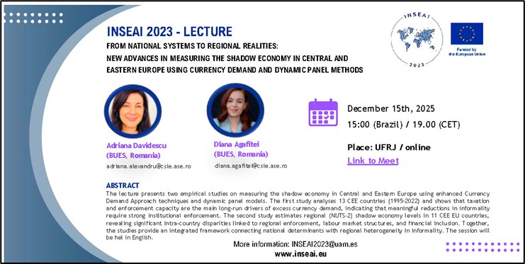 On 15 December, a lecture hosted at Universidade Federal do Rio de Janeiro (UFRJ) and online brought together Adriana AnaMaria Davidescu and Diana Marina Agafiței (Bucharest University of Economic Studies – BUES). Their presentation introduced new advances in measuring the shadow economy in Central and Eastern Europe, combining enhanced Currency Demand Approach techniques with dynamic panel models to better capture regional dynamics.