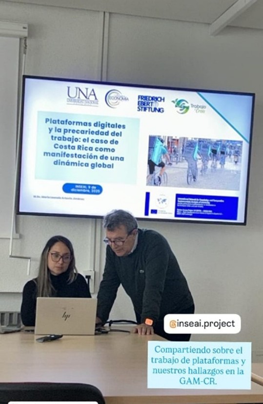 María Leonela Artavia presenting her research on job insecurity among digital platform delivery workers in Costa Rica during an INSEAI Discussion held on 9 December, with Professor Santos Ruesga, INSEAI project coordinator, also taking part in the session.